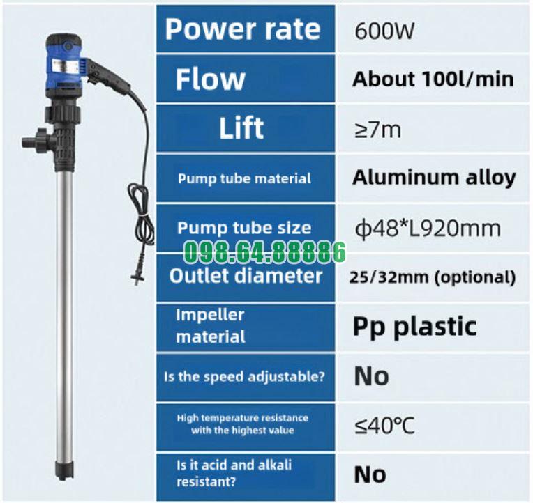Máy bơm thùng phuy điện JDT-L92-600W sử dụng motor điện 600W làm bộ phận tạo lực chính. Khi được cấp điện, motor quay và truyền chuyển động xuống trục bơm bên trong ống bơm, từ đó hình thành lực hút và lực đẩy chất lỏng.