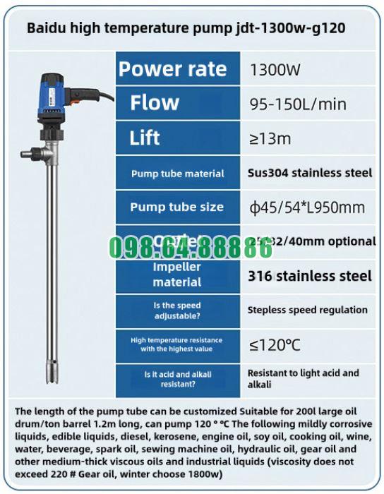 Bơm thùng phuy nhiệt độ cao JDT-1300W-G120 sử dụng linh kiện được lựa chọn đồng nhất về khả năng chịu nhiệt, giúp toàn bộ hệ thống hoạt động ổn định khi tiếp xúc chất lỏng nóng.