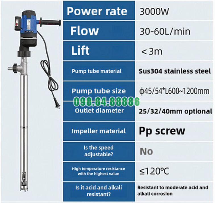 Những đặc điểm nổi bật của Máy bơm điện chất lỏng JDT-3000W-LGG120 nằm ở động cơ công suất lớn 3000W, lưu lượng bơm ổn định, cánh bơm trục vít chuyên dụng và ống bơm thép không gỉ SUS304 bền bỉ. Ngoài ra, khả năng chịu nhiệt cao và thiết kế phù hợp với thùng phuy 200L giúp thiết bị đáp ứng hiệu quả các yêu cầu bơm chất lỏng có độ nhớt cao trong môi trường công nghiệp.