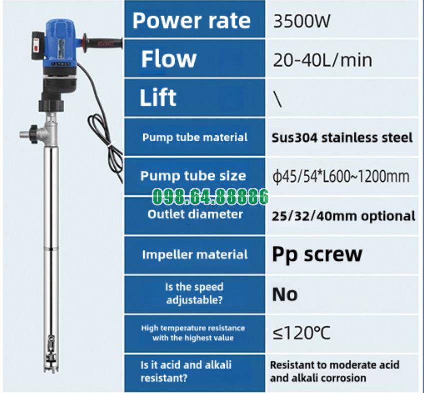 Công suất: 3500W;Lưu lượng: 20-40L/phút;Vật liệu ống bơm: Inox Sus304;Kích thước ống bơm: φ45/54*L600~1200mm;Đường kính đầu ra: Tùy chọn 25/32/40mm;Vật liệu cánh bơm: Vít Pp;Không Có điều chỉnh tốc độ;Khả năng chống nhiệt độ cao (với giá trị cao nhất): ≤120°C;Chống ăn mòn axit và kiềm vừa phải