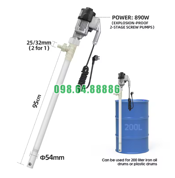 Thiết kế cắm trực tiếp giúp máy dễ dàng sử dụng với thùng phuy 200L hoặc các bồn chứa tiêu chuẩn mà không cần hệ thống lắp đặt phức tạp.