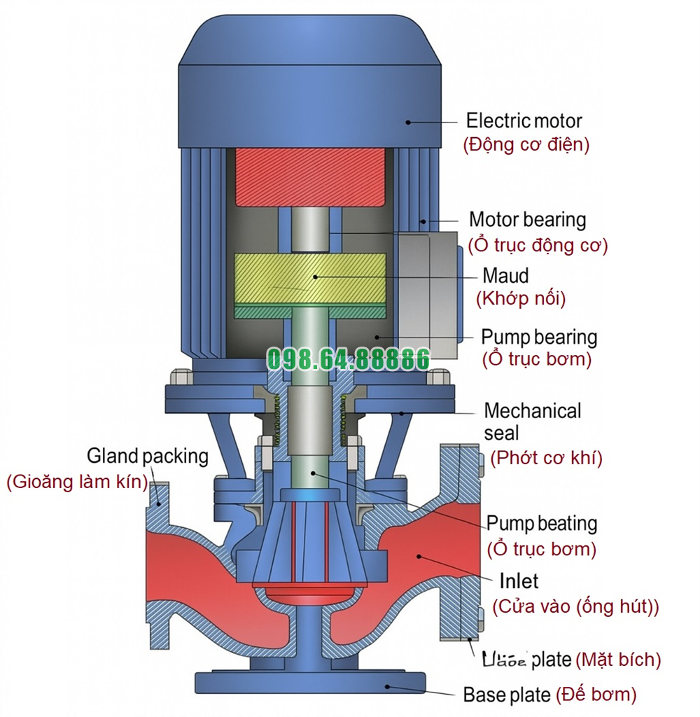 Hút và đẩy nước nóng: Nguyên lý tương tự ISG, nhưng cấu tạo ổ trục, phớt cơ khí và vật liệu được tối ưu để hạn chế biến dạng và rò rỉ khi chất lỏng có nhiệt độ lớn hơn 100°C.