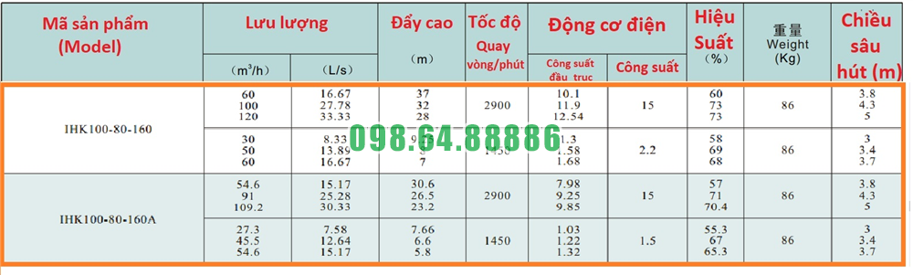 Bảng lưu lượng của máy bơm nước li tâm trục ngang cánh hở IHK100-80-160
