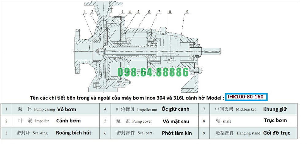 Máy bơm nước li tâm trục ngang cánh hở IHK100-80-160 có cấu tạo ưu việt