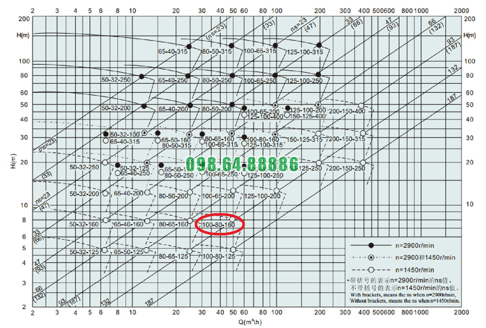 Đường cong hiệu suất của máy bơm nước li tâm trục ngang cánh hở IHK100-80-160