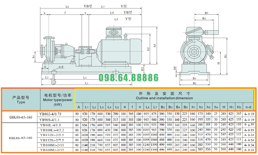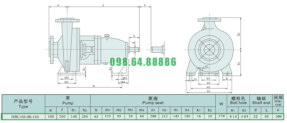 Kích thước của đầu máy bơm nước li tâm trục ngang cánh hở IHK100-80-160