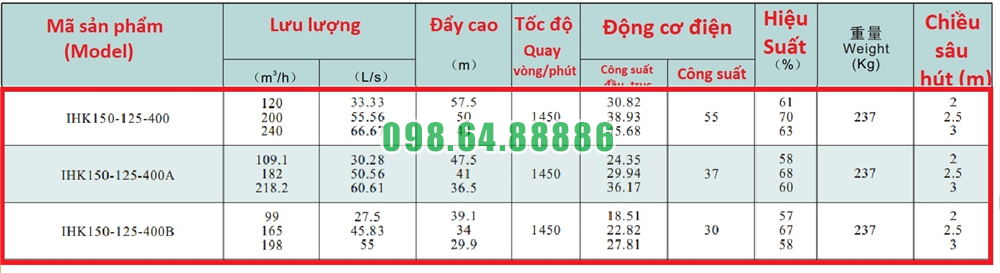 Bảng lưu lượng của máy bơm nước li tâm trục ngang cánh hở IHK150-125-400