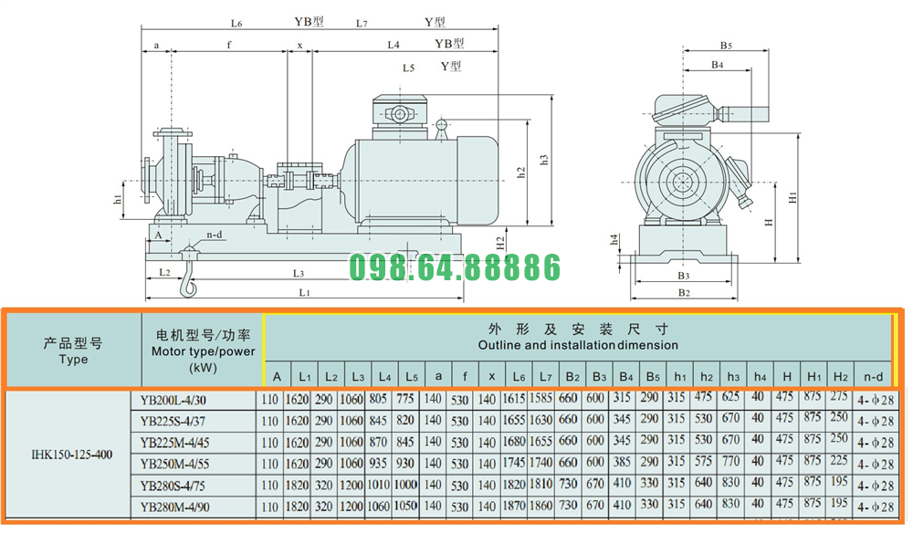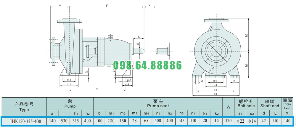 Kích thước của đầu máy bơm nước li tâm trục ngang cánh hở IHK150-125-400