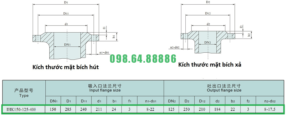 Kích thước mặt bích của máy bơm nước li tâm trục ngang cánh hở IHK150-125-400