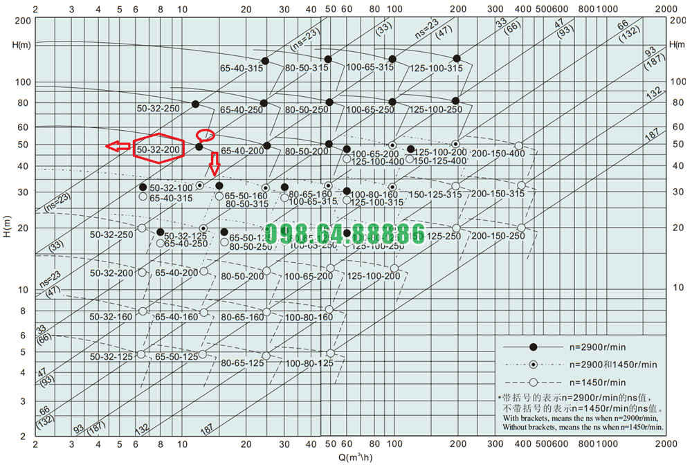 Đường cong hiệu suất của máy bơm nước li tâm trục ngang cánh hở IHK50-32-200