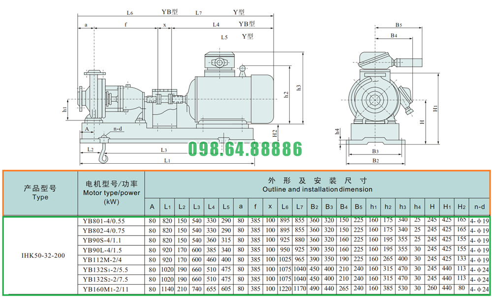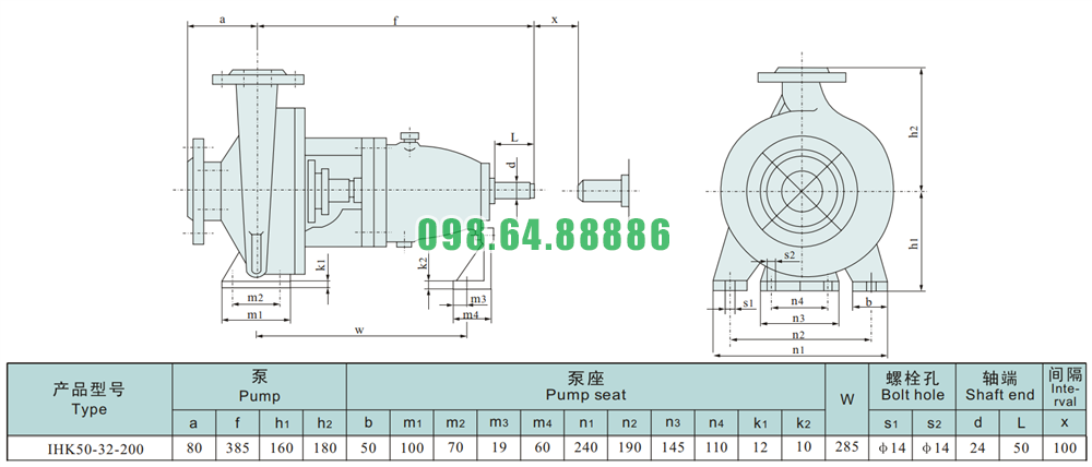 Kích thước của đầu máy bơm nước li tâm trục ngang cánh hở IHK50-32-200