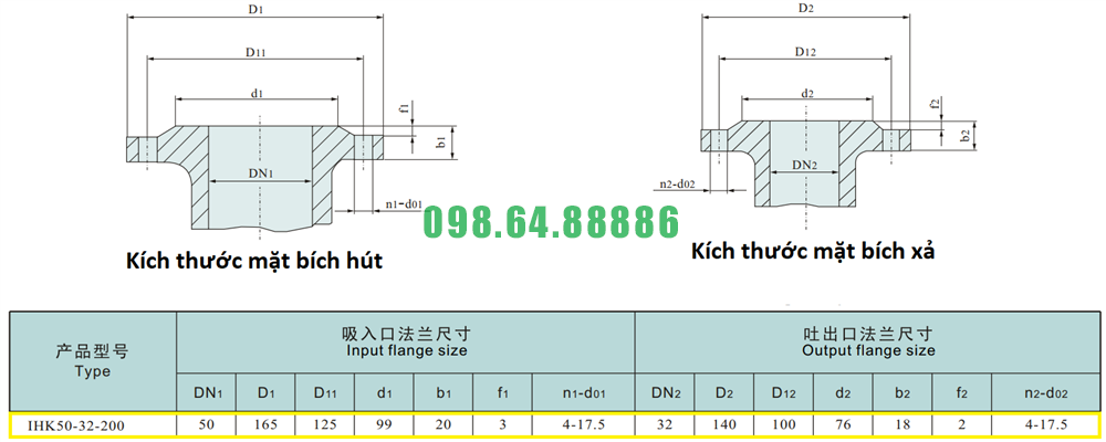 Kích thước mặt bích của máy bơm nước li tâm trục ngang cánh hở IHK50-32-200