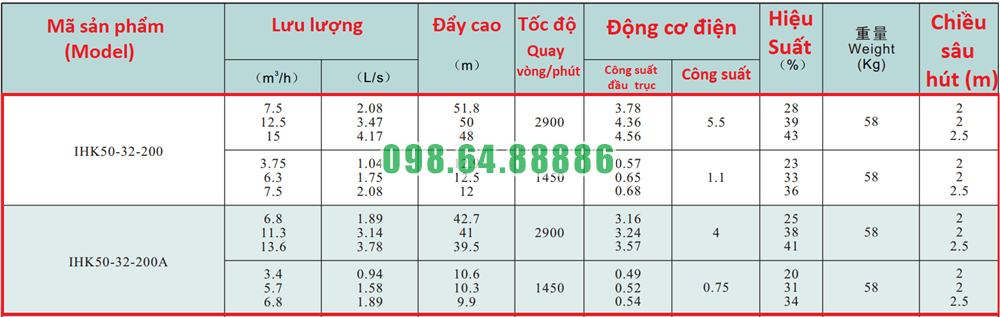 Bảng lưu lượng của máy bơm nước li tâm trục ngang cánh hở IHK50-32-200