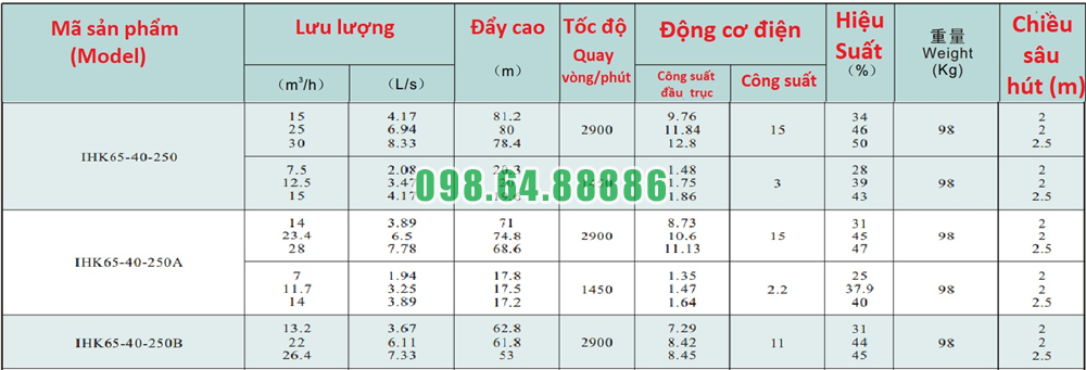 Bảng lưu lượng của máy bơm nước li tâm trục ngang cánh hở IHK65-40-250