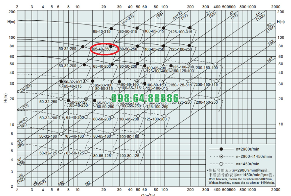 Đường cong hiệu suất của máy bơm nước li tâm trục ngang cánh hở IHK65-40-250