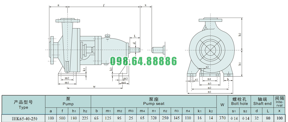Kích thước của đầu máy bơm nước li tâm trục ngang cánh hở IHK65-40-250