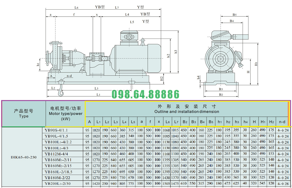 Kích thước lắp đặt của máy bơm nước li tâm trục ngang cánh hở IHK65-40-250