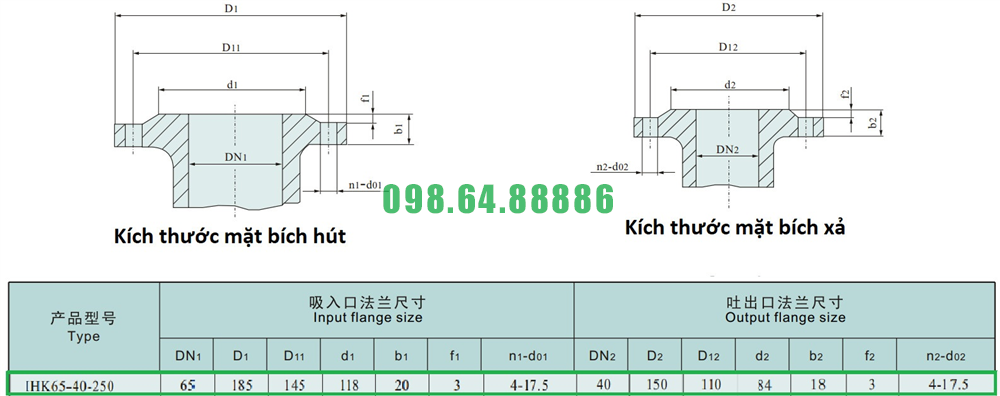 Kích thước mặt bích của máy bơm nước li tâm trục ngang cánh hở IHK65-40-250