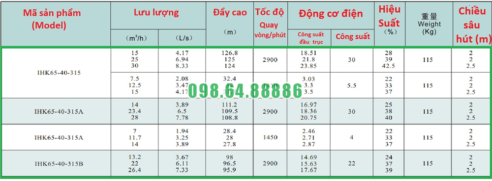 Bảng lưu lượng của máy bơm nước li tâm trục ngang cánh hở IHK65-40-315