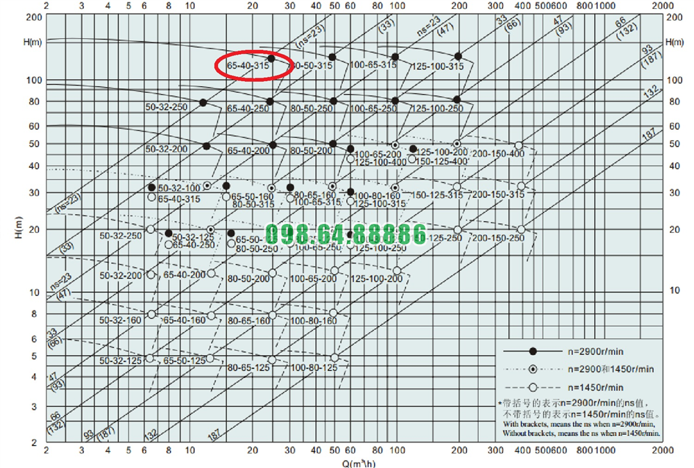 Đường cong hiệu suất của máy bơm nước li tâm trục ngang cánh hở IHK65-40-315