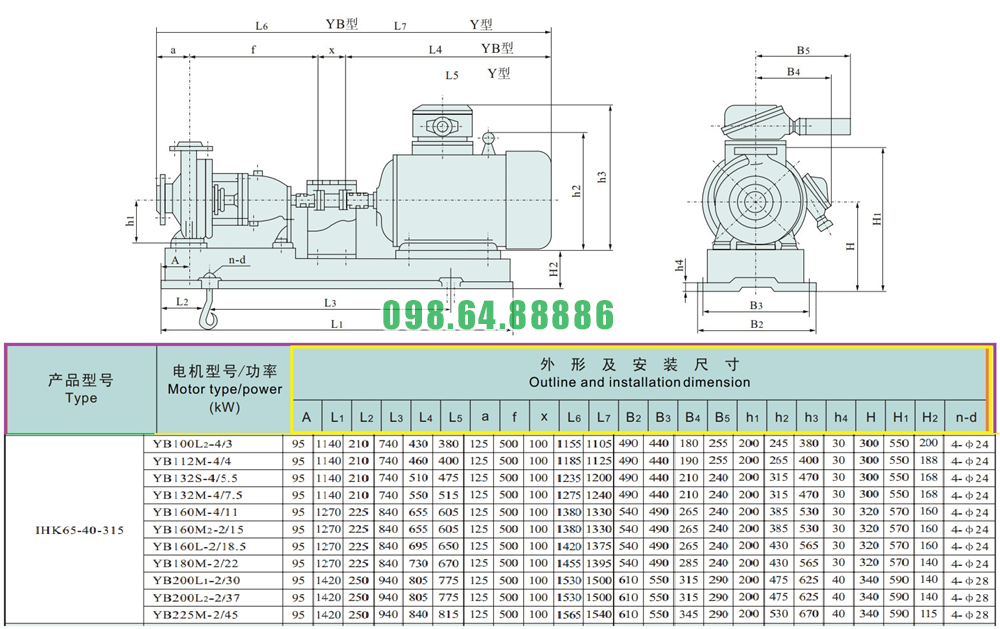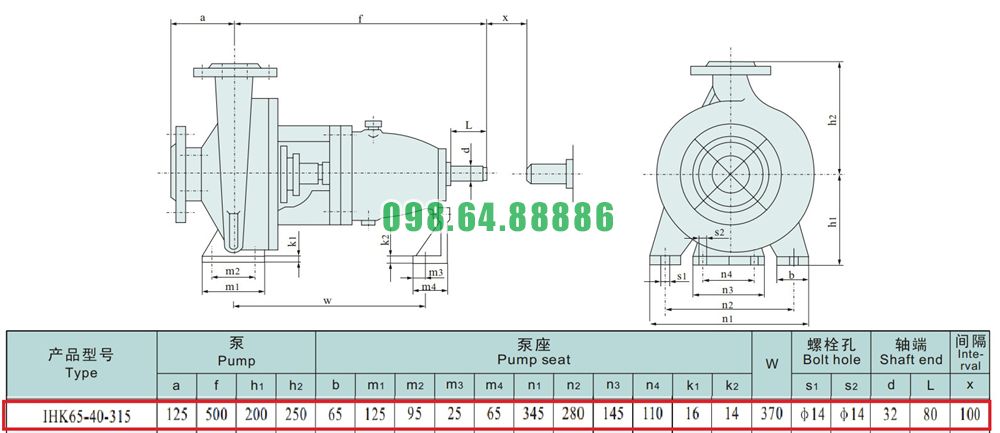 Kích thước của đầu máy bơm nước li tâm trục ngang cánh hở IHK65-40-315