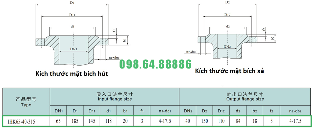 Kích thước mặt bích của máy bơm nước li tâm trục ngang cánh hở IHK65-40-315