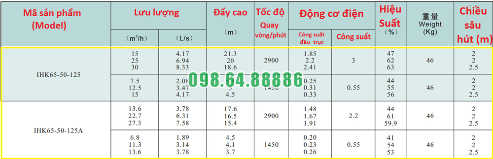 Bảng lưu lượng của máy bơm nước li tâm trục ngang cánh hở IHK65-50-125