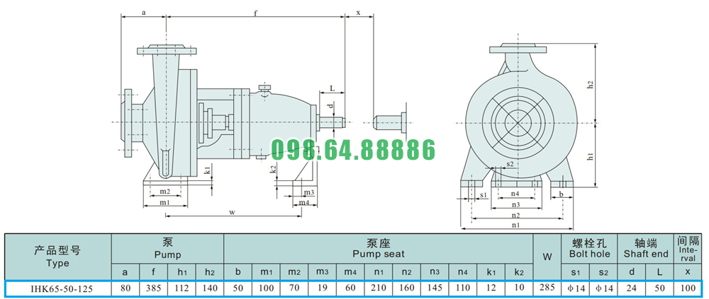 Kích thước của đầu máy bơm nước li tâm trục ngang cánh hở IHK65-50-125