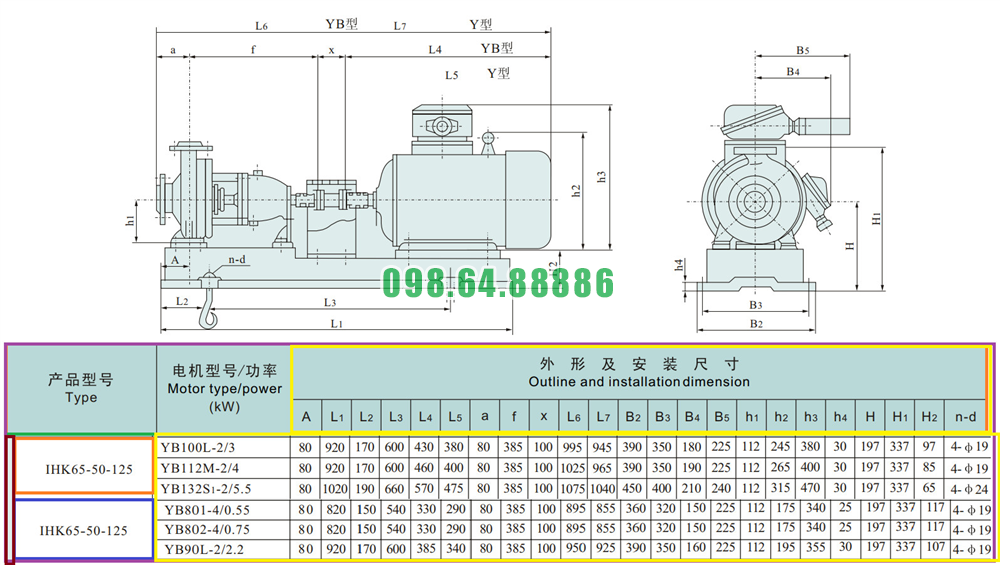 Kích thước lắp đặt của máy bơm nước li tâm trục ngang cánh hở IHK65-50-125
