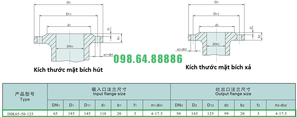 Kích thước mặt bích của máy bơm nước li tâm trục ngang cánh hở IHK65-50-125
