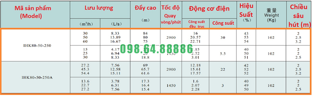 Bảng lưu lượng của máy bơm nước li tâm trục ngang cánh hở IHK80-50-250