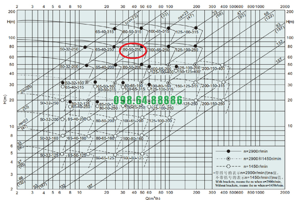 Đường cong hiệu suất của máy bơm nước li tâm trục ngang cánh hở IHK80-50-250