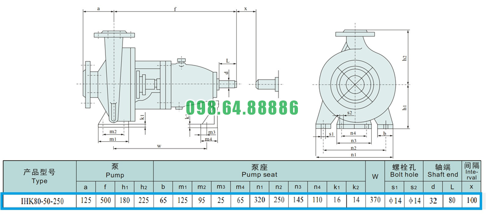 Kích thước của đầu máy bơm nước li tâm trục ngang cánh hở IHK80-50-250
