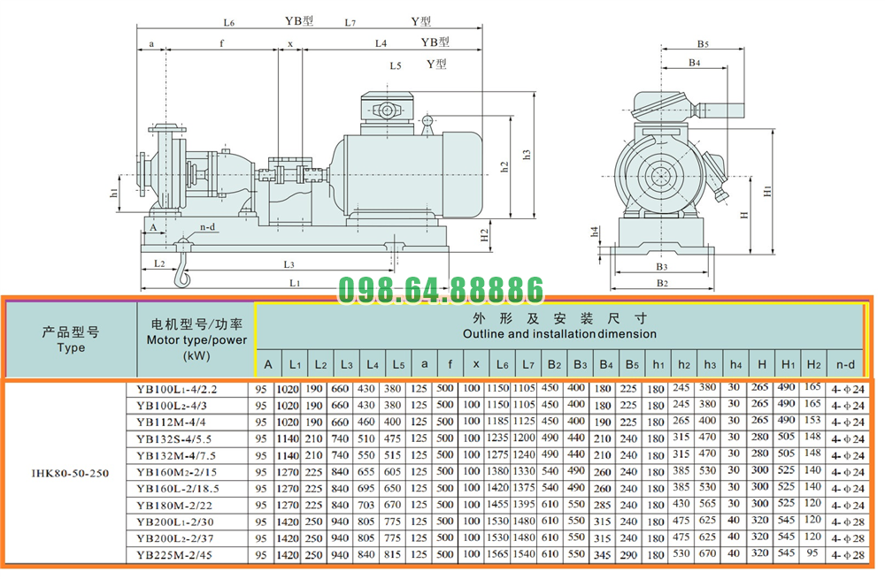 Kích thước lắp đặt của máy bơm nước li tâm trục ngang cánh hở IHK80-50-315
