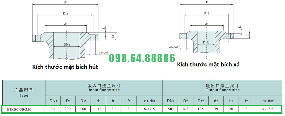 Kích thước mặt bích của máy bơm nước li tâm trục ngang cánh hở IHK80-50-315