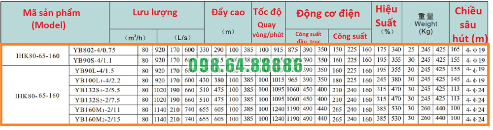 Bảng lưu lượng của máy bơm nước li tâm trục ngang cánh hở IHK80-65-160
