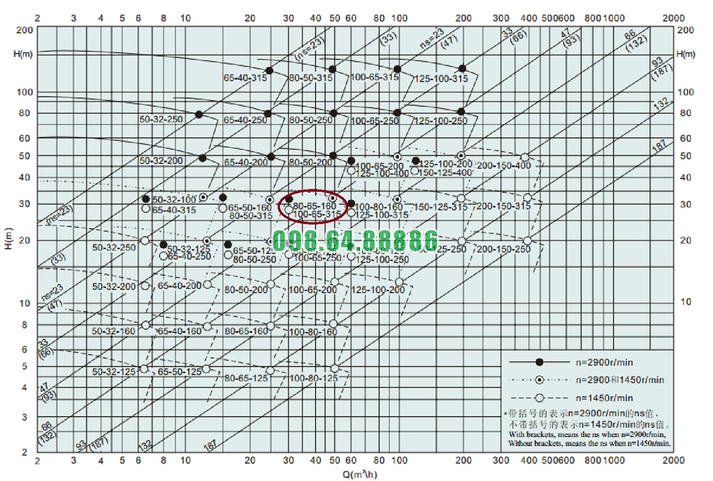 Đường cong hiệu suất của máy bơm nước li tâm trục ngang cánh hở IHK80-65-160