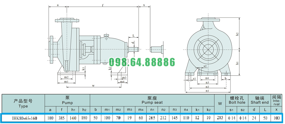 Kích thước của đầu máy bơm nước li tâm trục ngang cánh hở IHK80-65-160