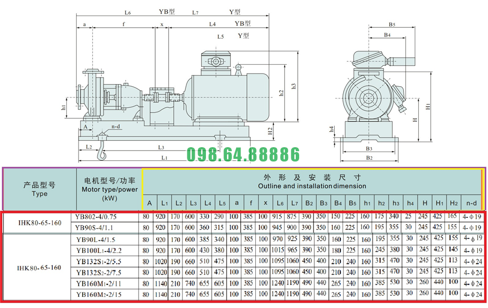 Kích thước lắp đặt của máy bơm nước li tâm trục ngang cánh hở IHK80-65-160