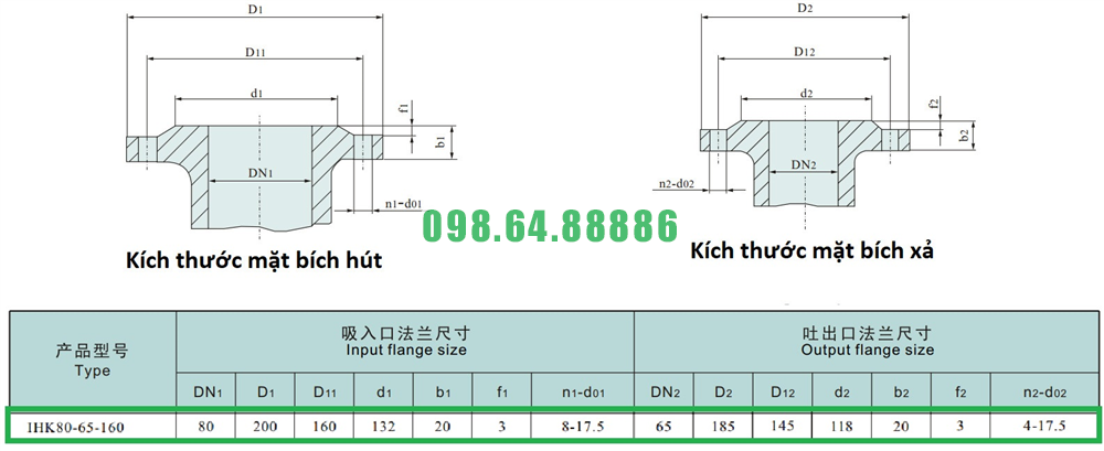 Kích thước mặt bích của máy bơm nước li tâm trục ngang cánh hở IHK80-65-160