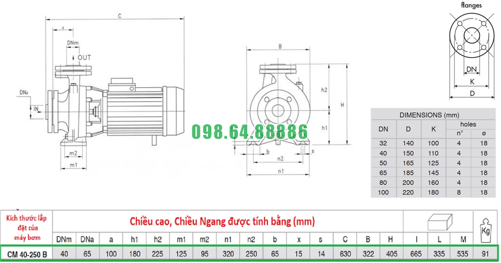 Kích thước máy bơm nước li tâm trục ngang CM40-250A