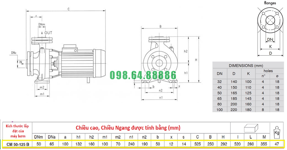 Kích thước máy bơm nước li tâm trục ngang CM50-125B