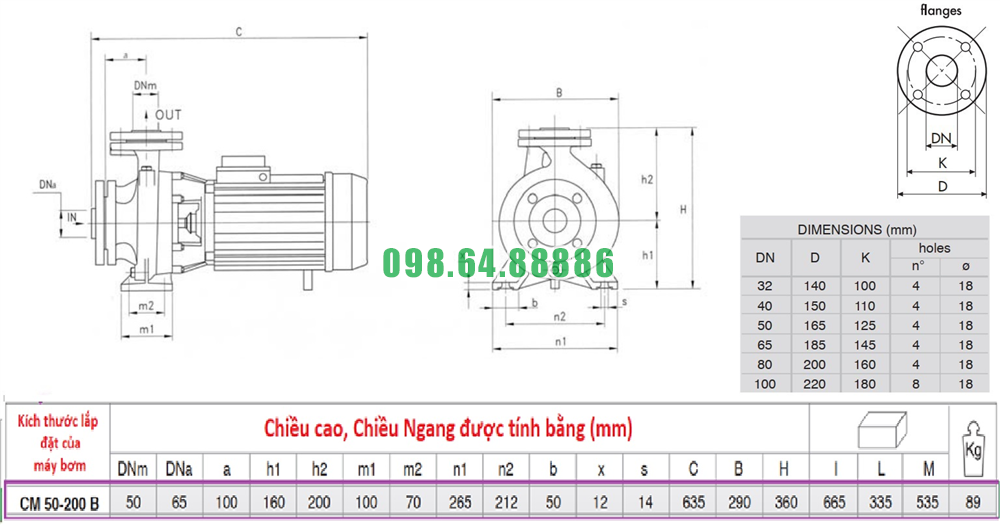 Kích thước máy bơm nước li tâm trục ngang CM50-200B