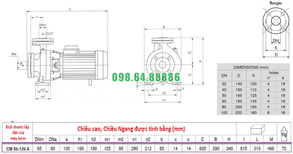 Kích thước máy bơm nước li tâm trục ngang CM65-125A