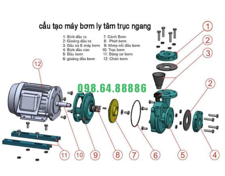 Động cơ (Motor): Bộ phận cung cấp năng lượng để vận hành máy bơm. Thông thường, động cơ sử dụng trong máy bơm này là động cơ điện ba pha.