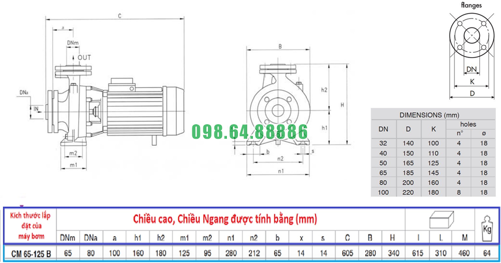 Kích thước máy bơm nước li tâm trục ngang CM65-125B