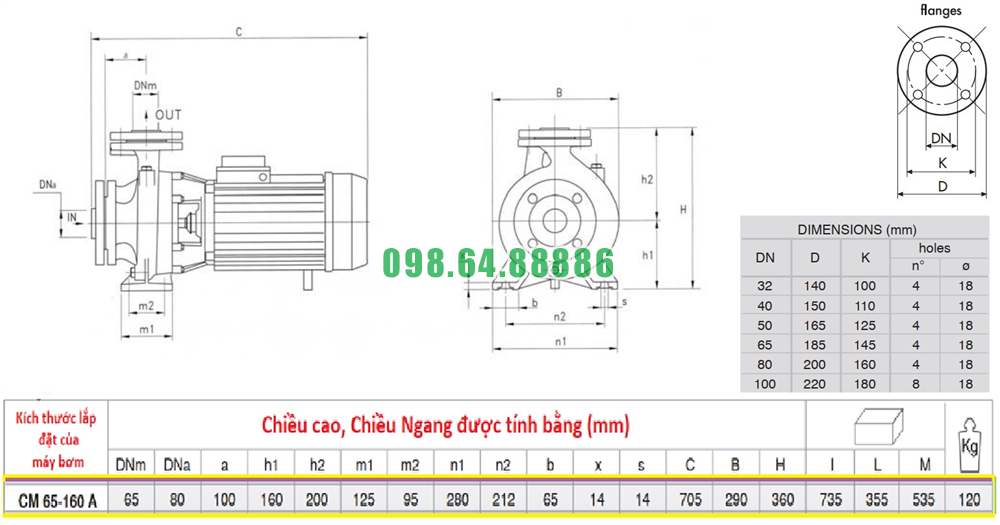 Kích thước máy bơm nước li tâm trục ngang CM65-160A