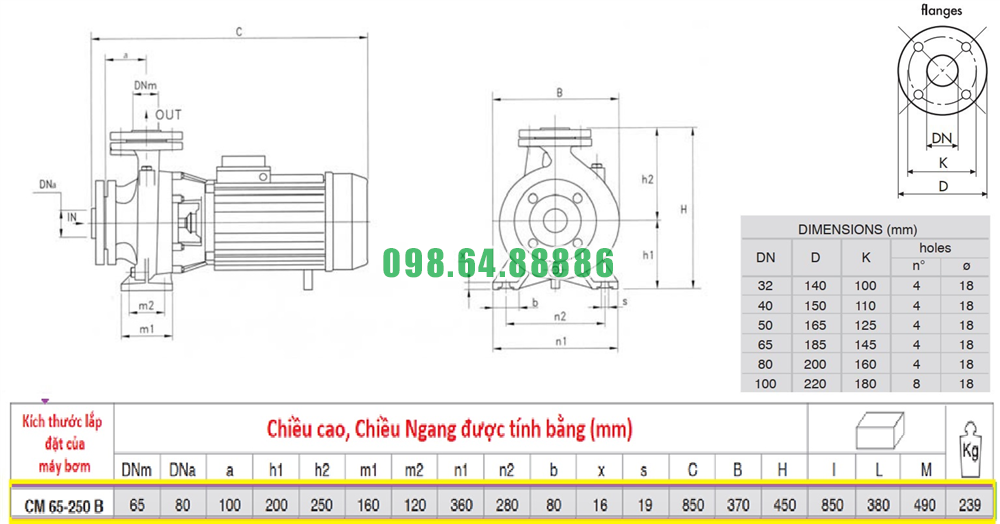 Kích thước máy bơm nước li tâm trục ngang CM65-250A