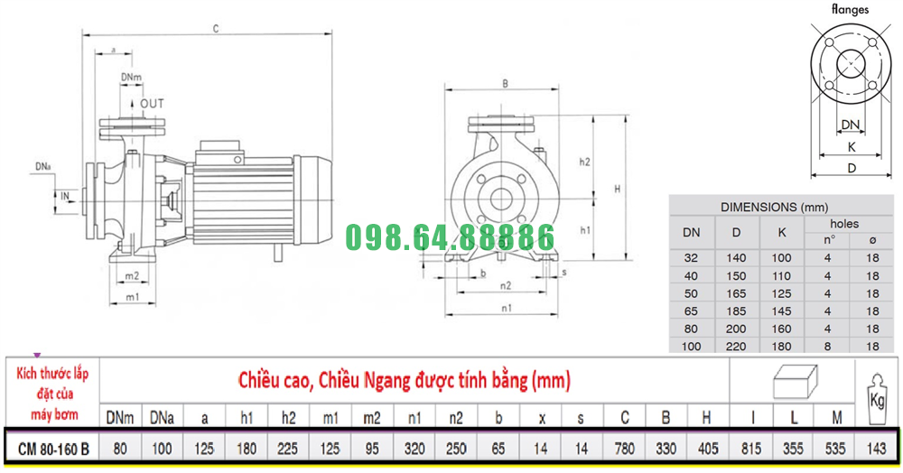 Kích thước máy bơm nước li tâm trục ngang CM80-160A