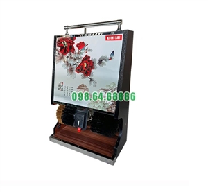 - Chất liệu: Gỗ kết hợp với inox ở phần thân máy, kính ở bề mặt tranh quảng cáo. - Sổ chổi: 2 chổi đánh bóng màu đỏ và màu đen, 2 chổi đánh bụi - Hộp đựng xi: 200ml